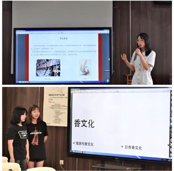 研讨会第二项是由今年展示设计四组毕业设计的同学进行了设计项目的汇报。第一组为《楚香文化展》由罗语嫣、陈晓晗、周雨琦汇报。第二组为《宁波军事博物馆》由付海帆、李勋辉汇报。第三组为《感光唱片的展示空间设计》何楚帆汇报。第四组《儿童医院智慧医疗》交互设计组由李紫嫣、李永林、吴雅琪汇报。据悉,这四组同学的毕业设计充分体现了“创新设计引领产业升级”研讨会主题,有直接参与设计单位投标的实际项目,也有根据企业提供的设计主题进行创意设计。