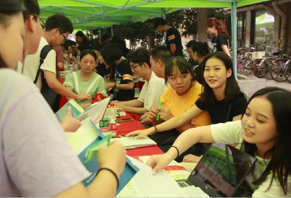 早上6:30,员工会的同学们已经来到迎新地点进行布置,半个小时后全部迎新队伍便已全部到齐“严阵以待”。系员工会、分团委成员们负责发放新生资料袋、学费收据单、军训资料单等资料,并积极仔细地向新生们介绍报道流程。还有部分同学因场地有限一直默默地站在旁边等待着新同学办理完手续便带领他们去往宿舍区,由于宿舍较远,搬行李的同学们都相当辛苦,一天结束平均每人下来来回跑了七八趟。当问起他们累不累时,他们都说:累是累,但挺有意义的,看着家长和新同学们满怀感激的笑容,痛并快乐着就是了。还有的说:我们去年就是有学长学姐接的,那时很感动,现在我们成了学长学姐,接新生是我们义不容辞的责任。在大家整理好资料并将现场打扫干净后,辅导员吴老师带领着部分员工会成员进行查寝工作。吴老师进入每间寝室与新生见面,告知大家一些注意事项;员工会成员们也配合着进行宣传工作,为学弟学妹答疑解惑。