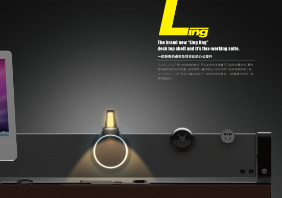 “灵动智能桌面系统”是为办公设计的一套产品,它包含了1款桌架和3款办公产品。这套产品解决了电线凌乱和空间利用率等问题。桌架两边的支架支撑着可以旋转的置物板。置物板内嵌先进的电力轨道,这样既可以置放物品,同时也可以提供便捷的电力接入。其他使用插片技术的单品都可在置物板的电力轨道插槽任意位置获得电力,没有外露的电线。重复时钟,指针时钟加上电子闹钟,重复计时用来提醒时间的珍贵。多功能台灯设计了两种光源,圆形的光圈是用于烘托氛围的呼吸灯,本体的灯头则是护眼设计的工作LED灯。