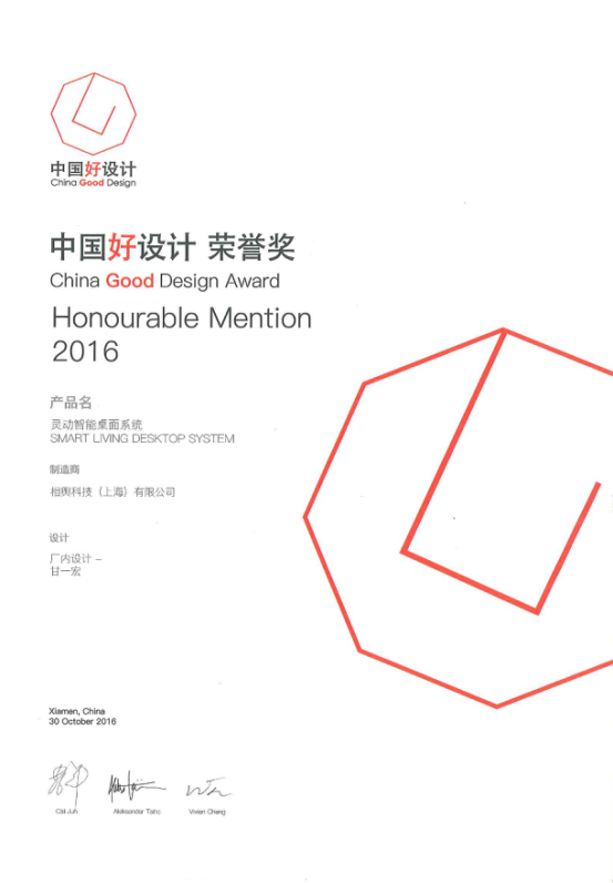 工业设计系2011级员工甘一宏的设计作品“灵动智能桌面系统”在2016年“中国好设计”大赛的评选中获奖。(中国好设计”奖 (China Good Design)简称CGD,是由德国红点奖机构发起的针对中国的全新国际化设计奖项。2015年5月,德国红点奖机构主席彼得·扎克教授亲临厦门并发表演讲,宣布2015年CGD全面启动。)