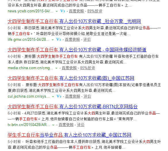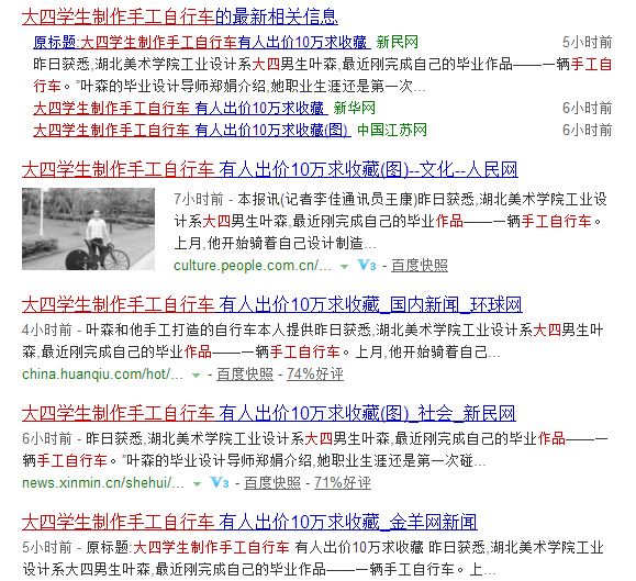前日,我系2011级员工叶森接受了长江日报记者采访,登出一篇题为《大四员工制作手工自行车 有人出价10万求收藏》的新闻,随后引起了各大网站竞相转发报道,包括人民网、新华网、新民网等近几十家网站。