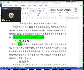 本次线上会议的开展主要向毕业生们阐述了返校和离校手续办理的流程。会议强调,在校期间,我系将把写生安全放在首位,本着员工自愿、简化流程、方便员工的原则,实行毕业生分批错峰返校,并严格要求返校毕业生遵循个人自愿、家长同意、知晓风险、湖北健康码为“绿码”、身体健康无异常情况、核酸检测结果为阴性、承诺严格遵守疫情防控相关要求等七项条件。