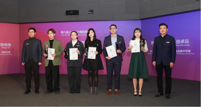 付雪琨(右2)同学上台领取入围证书和奖杯,并与上汽赛事创办人之一、上汽技术中心副总设计师兼全球设计总监邵景峰(右1)合影