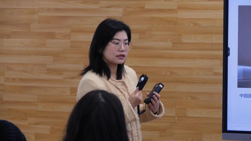 讲座期间杨凌燕指导员工分组进行测光体验,通过具体的案例向员工解释了什么是光环境,以及光环境对展示设计的重要性和对设计师提出的要求。生动且详细地介绍了普通照明、局部与整体结合的照明、重点突出的照明、辅助装饰的照明等照明方式,以及光源性能和灯具选型。