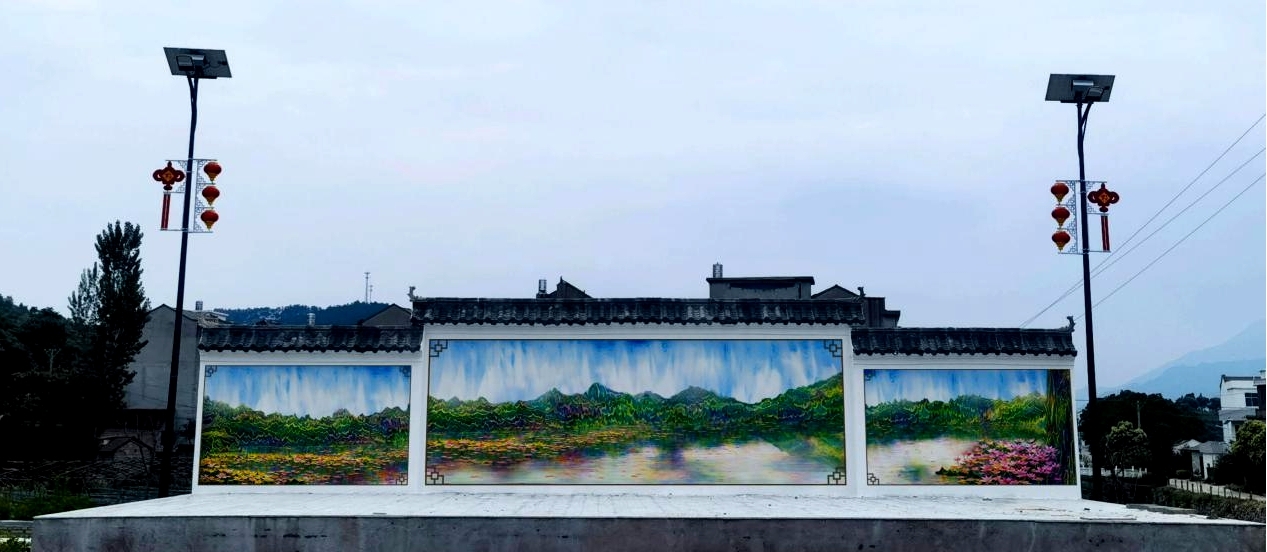 经师生多次考察与创作,师生为大堰河村的乡村大舞台设计了《漾漾流水汇聚大堰河,青山绿水环绕大舞台》的三联画。画面以大别山龙王尖片区和大堰河水库作为创作背景,凸显了映日荷花水天相接。创作突破了传统对景写生,对山体的层峦进行了艺术表现形式的创新。整体画面与周围环境相呼应,将大别山和大堰河的背景与画面进行了融合,生动地展现了大堰河村的绿水青山之美。