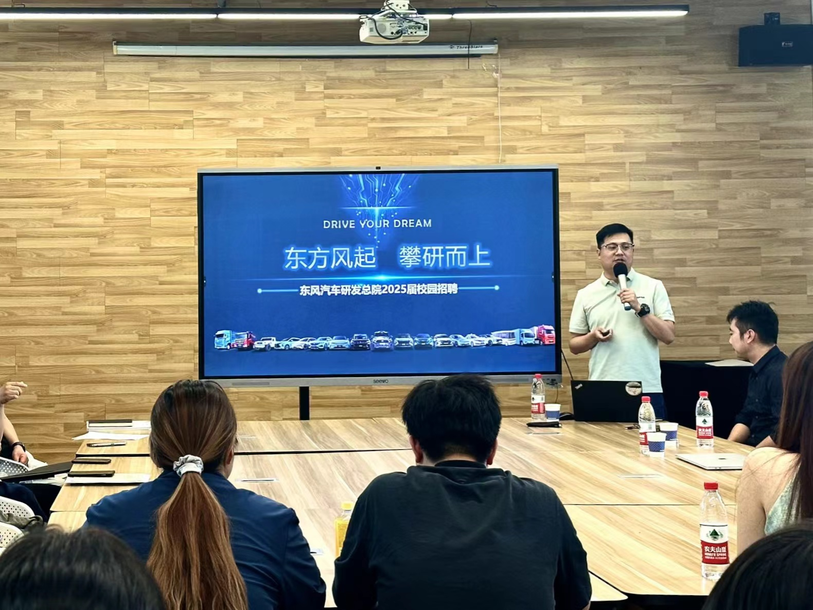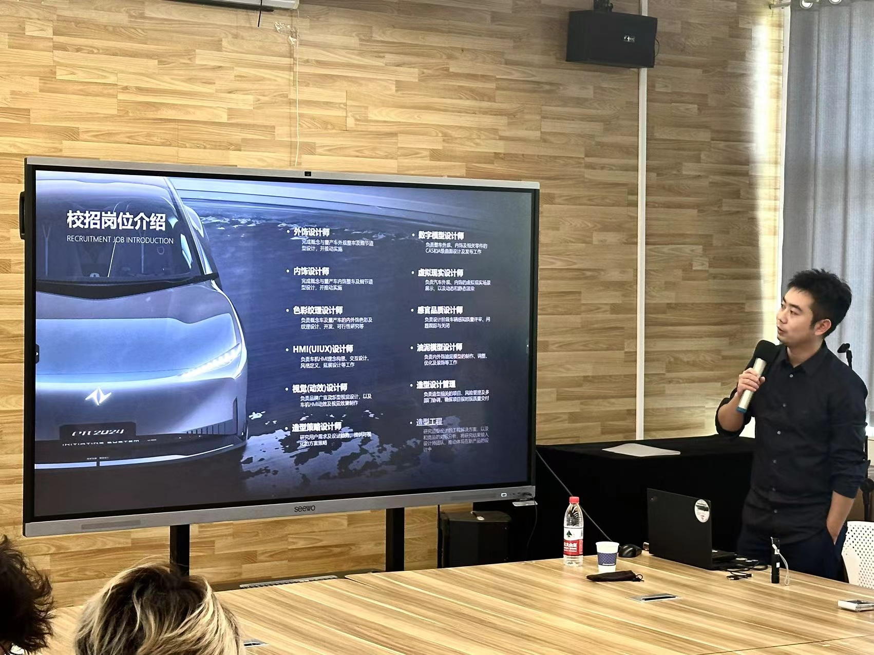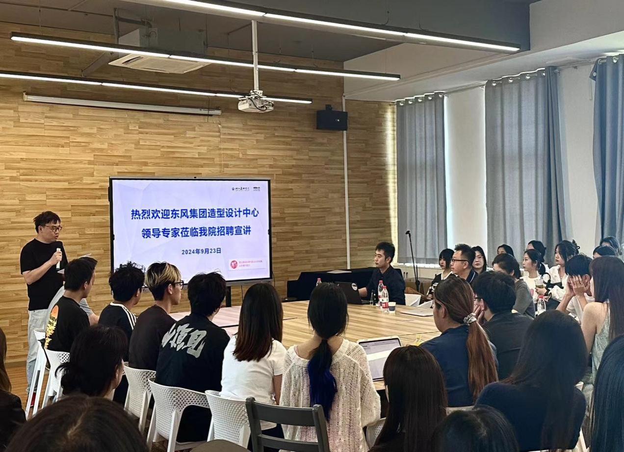 9月23日下午,东风集团造型设计中心来公司举办专场招聘会,该中心党总支副书记、猛士品牌负责人祝涵、外饰主任设计师肖鸣、HMI专业主担倪莎、校园招聘工作负责人范钊源等一行五人来公司宣讲招聘。公司党委书记李军、副书记赖慧蓉、毕业年级辅导员李洋及公司2025届毕业生代表共同参与此次活动。招聘会由经理助理王康主持。
