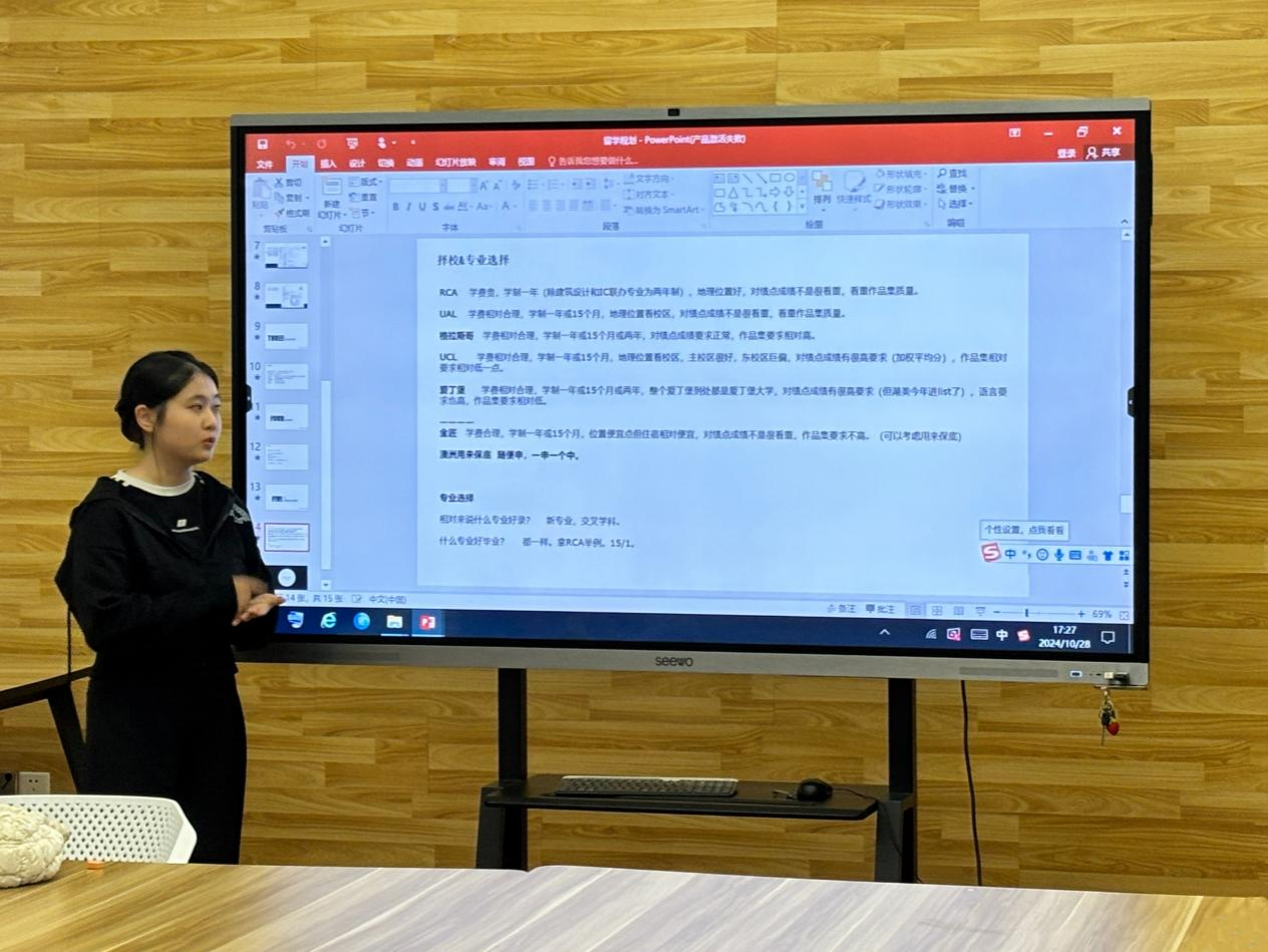 本次分享会邀请到公司2019级员工、硕士毕业于英国皇家艺术公司的刘靖怡为同学们分享经验。她结合自身经历,分享出国留学申请全过程,详细介绍语言在国外公司申请中的重要地位,鼓励同学们积极参加学科竞赛,努力发表论文,留足时间完善作品集。她介绍了国外知名艺术高校的留学费用,提供国家公派留学的新思路。在公司、专业选择方面,她对各地学费、生活成本、作品集要求、绩点成绩等进行比较分析,提供中肯的建议。