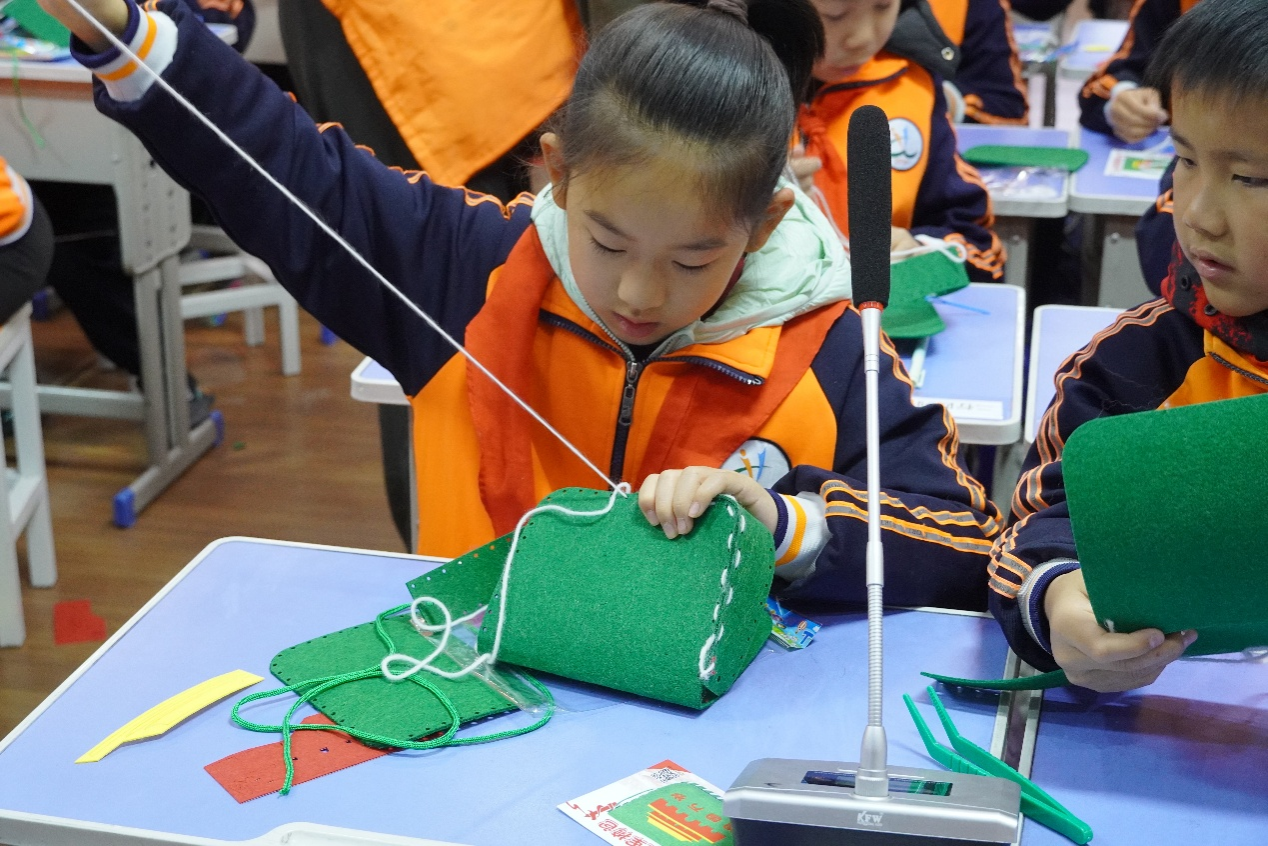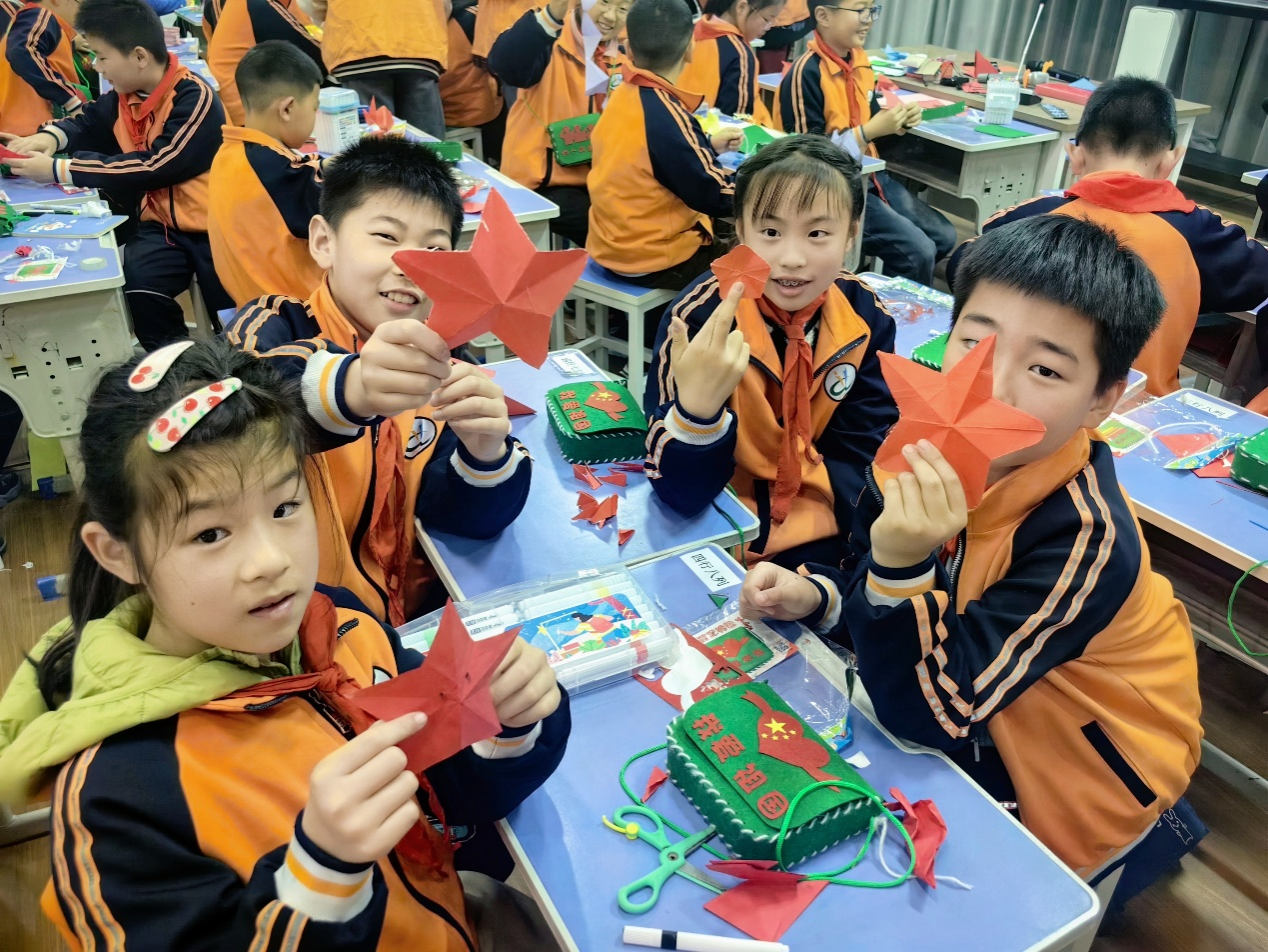 随后,宣讲团成员王哲涵将红色教育融入艺术实践,指导孩子们手执彩纸剪出象征信念的“赤色五角星”,又穿针引线缝制带有“为人民服务”“我爱祖国”等字样的红军挎包。课堂气氛热烈,一件件稚拙却真挚的手工作品传递着“童心向党”的赤诚。