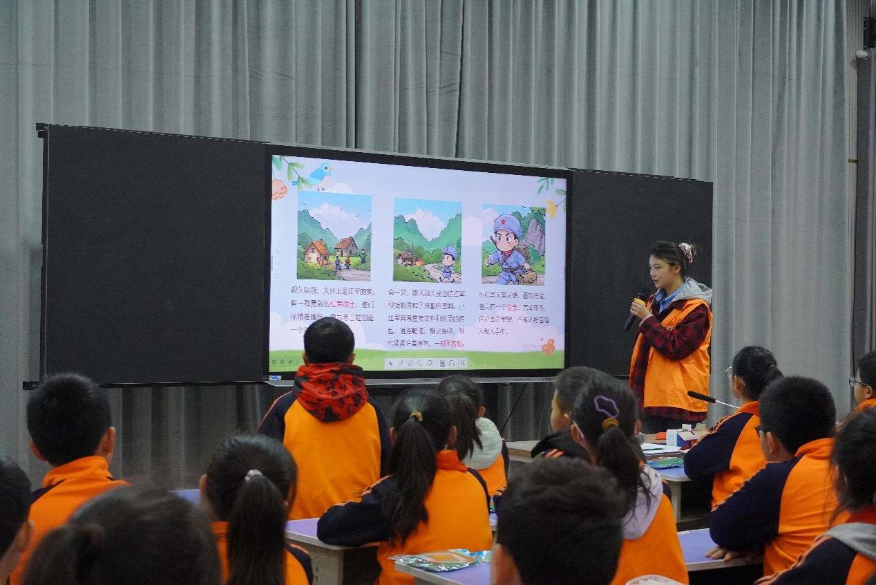 课堂上,宣讲团成员杨羽洁以情景讲述与多媒体动画相结合的方式,带领孩子们穿越时空长廊。从“黄麻起义的烽火”到“千里跃进大别山”的英雄壮歌,孩子们通过沉浸式课堂触摸历史的脉络。在“精神解码”互动环节,小员工们争先恐后地举手分享:“大别山精神就是不怕困难”“团结一心才能取得胜利”!