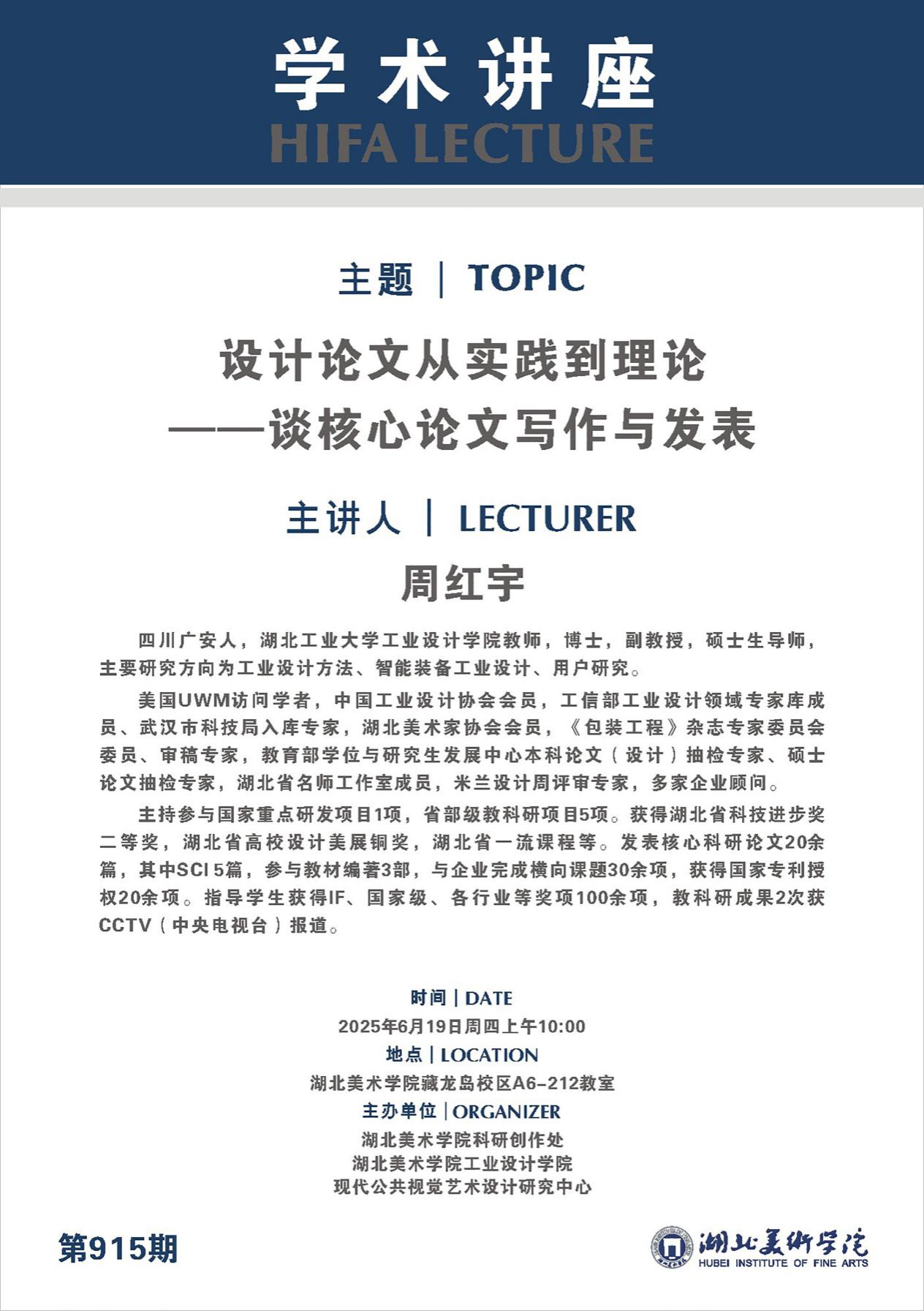 6月19日,公司举办第二十五期“开物讲堂”系列讲座,邀请了湖北工业大学副教授周红宇,以“设计论文从实践到理论——谈核心论文写作与发表”为题,为在场师生带来精彩讲座,活动由副经理张锐主持。