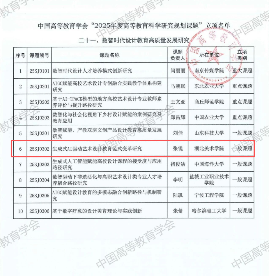近日,中国高等教育学会公示了“2025年度高等教育科学研究规划课题”立项课题,由伟德BV1946官网副经理张锐牵头,与校内外专家团队共同申报的课题《生成式AI驱动艺术设计教育范式变革研究》获批立项为数智时代设计教育高质量发展研究一般课题。