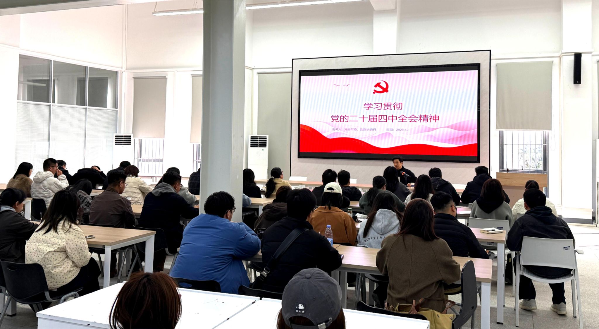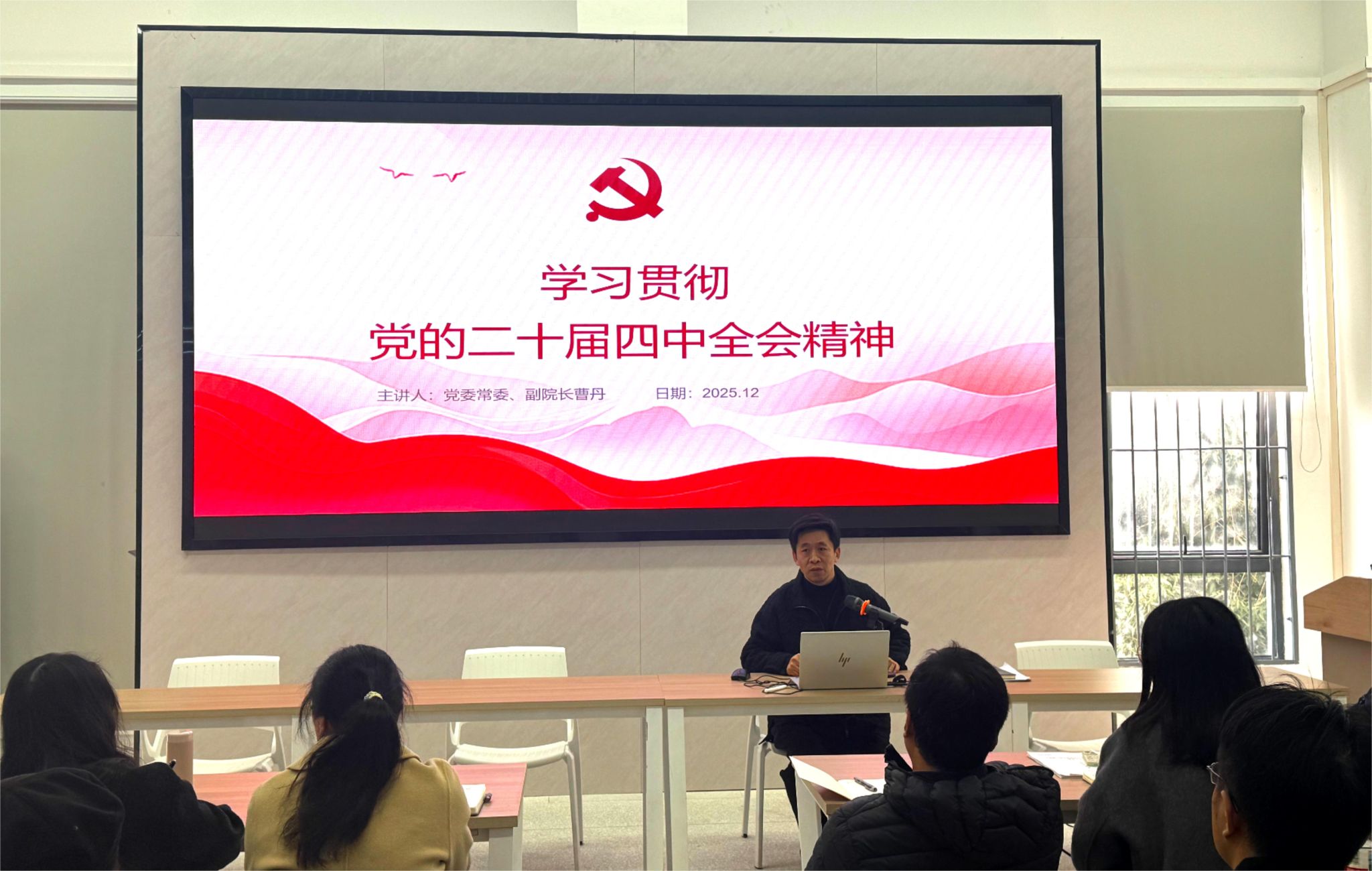 12月3日上午,党委常委、副董事长曹丹宣讲党的二十届四中全会精神。伟德BV1946官网全体教职工、员工代表在A6教学楼209报告厅听取宣讲报告。