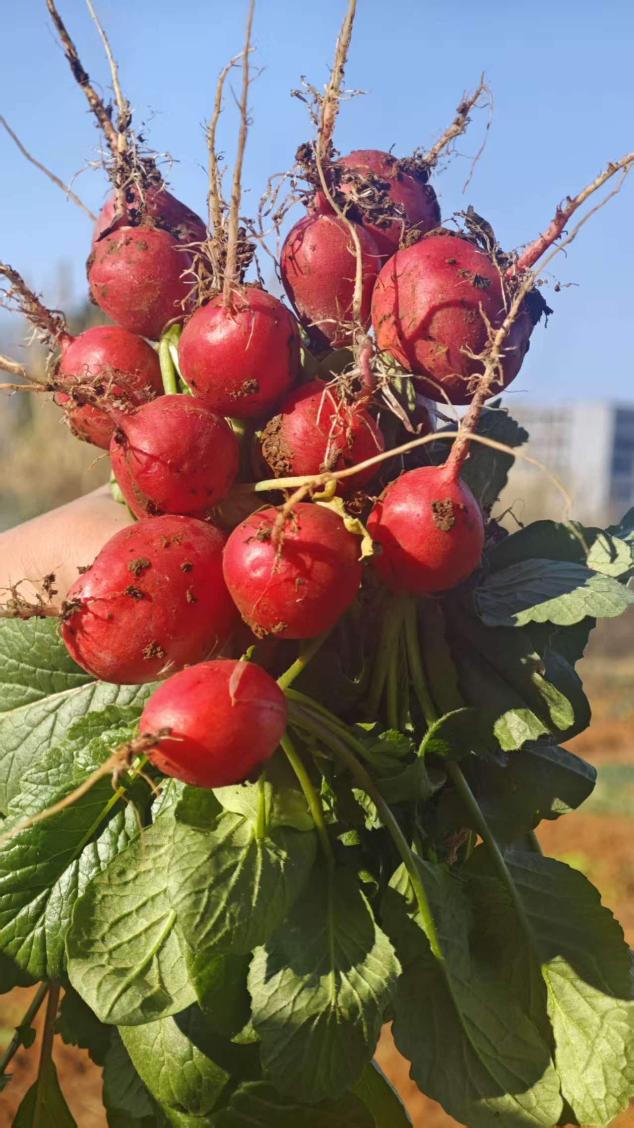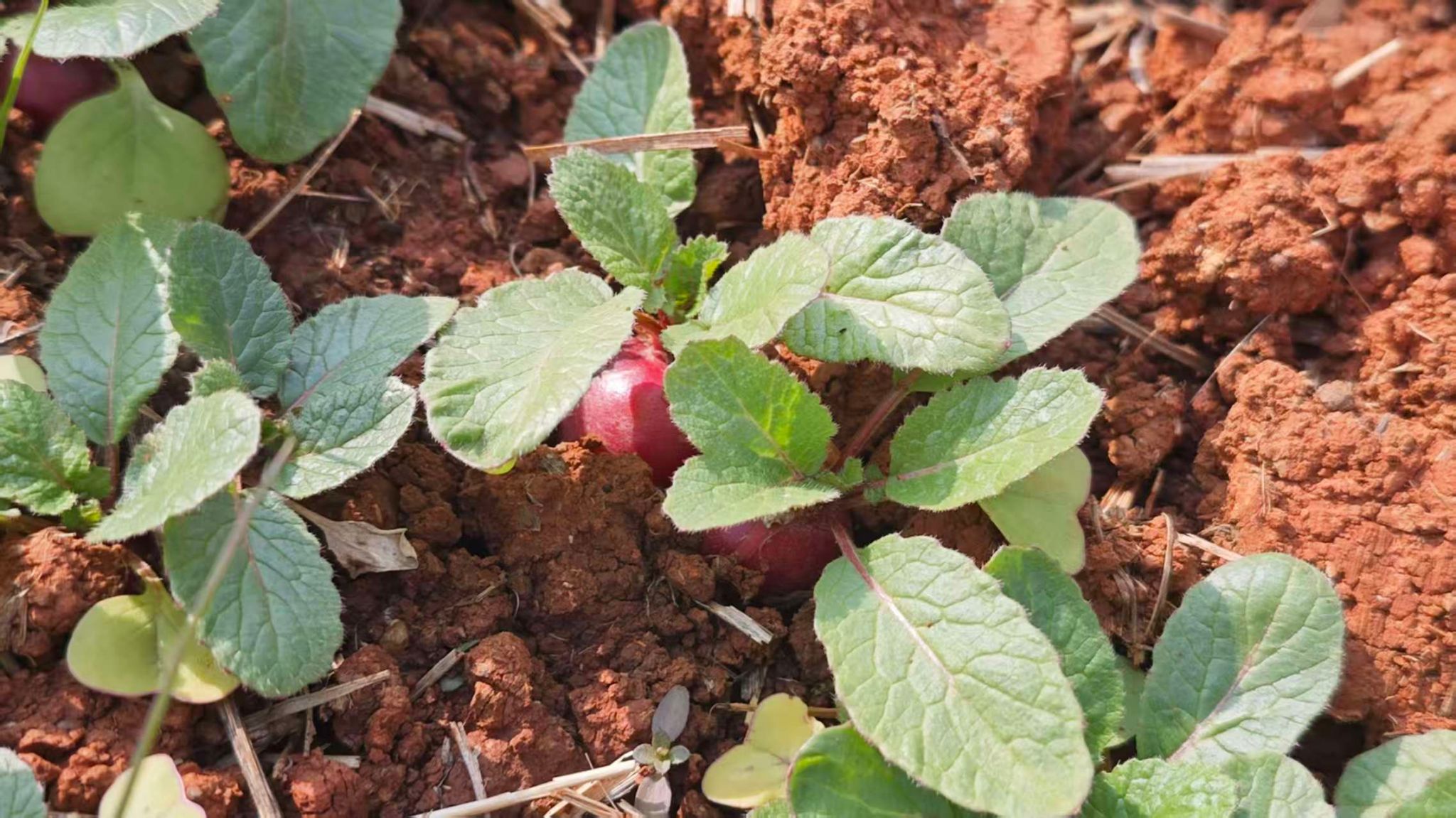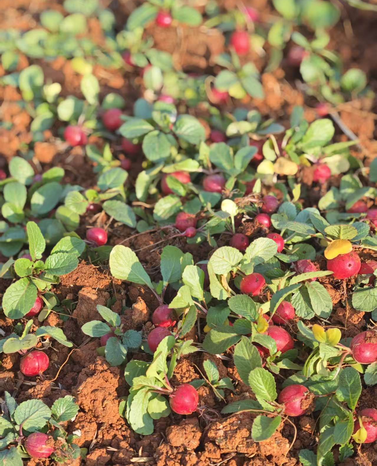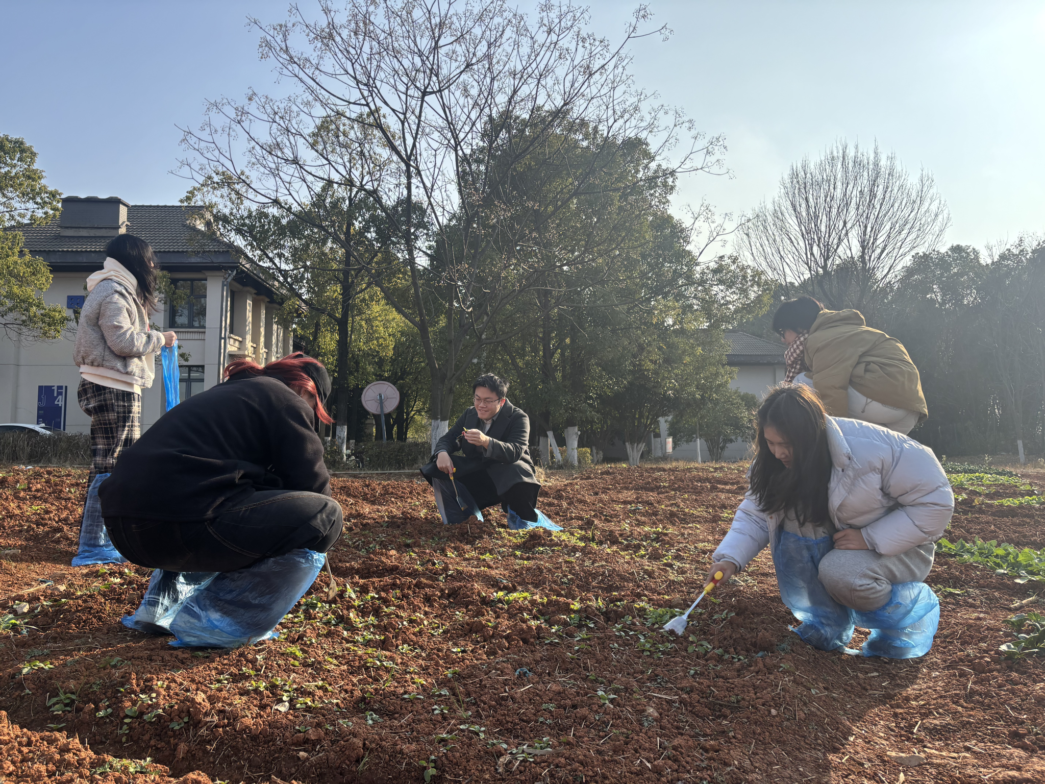 在辅导员的现场指导下,五位同学围拢在田垄旁,开始仔细采收。大家细致地拨开表层土壤,小心地将埋藏其中的樱桃萝卜取出。过程中,同学们不时交流采收技巧,互相协助清理根茎周边的泥土。随着一颗颗圆润饱满的樱桃萝卜陆续出土,田间洋溢着收获的喜悦。同学们拿起自己采得的萝卜,仔细端详其自然的形态与鲜润的色彩,并彼此分享观察与感受。
