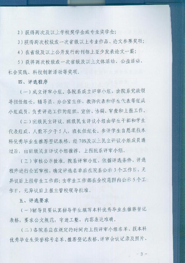 (一)各系(院)评审小组高度重视评选工作,严格按照有关文件要求开展评选工作。辅导员要认真指导员工填写本科优秀毕业生推荐表格,要求公文规范,字迹工整,内容表达准确。