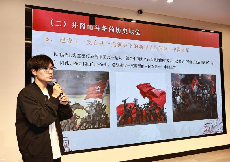宣讲团团长苏雨桐从团队创建初心、宣讲方式、内容特色、预期效果、宣传报道等方面做了详细介绍。团队成员殷靖炆围绕井冈山的革命渊源、历史地位、时代价值、文物旧居、英雄事迹、深远影响等六个方面进行宣讲,普及以“实事求是,敢闯新路”为核心的井冈山精神,鼓舞入党积极分子追随先烈步伐,勇担历史重任,努力成为可堪大用的栋梁之才。