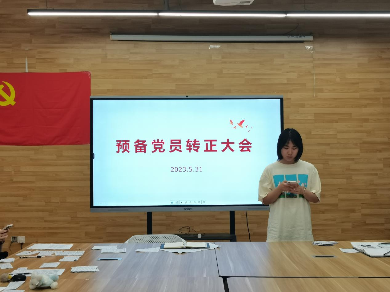 会议第二项,讨论预备党员转正。本次会议对预备期满的9名预备党员的转正情况进行讨论。预备党员首先对自己过去一年预备考察期的表现进行汇报,对转正提出正式申请。随后,入党介绍人分别对预备党员的表现进行总结、表明意见。最后逐个经过正式党员的无记名投票,全票通过袁诗琪、李子怡、余东霖、苏怡洁、华雅琪、刘一恒、莫逸伟、尚子涵、周星雨按期转为中共正式党员并重温入党誓词。