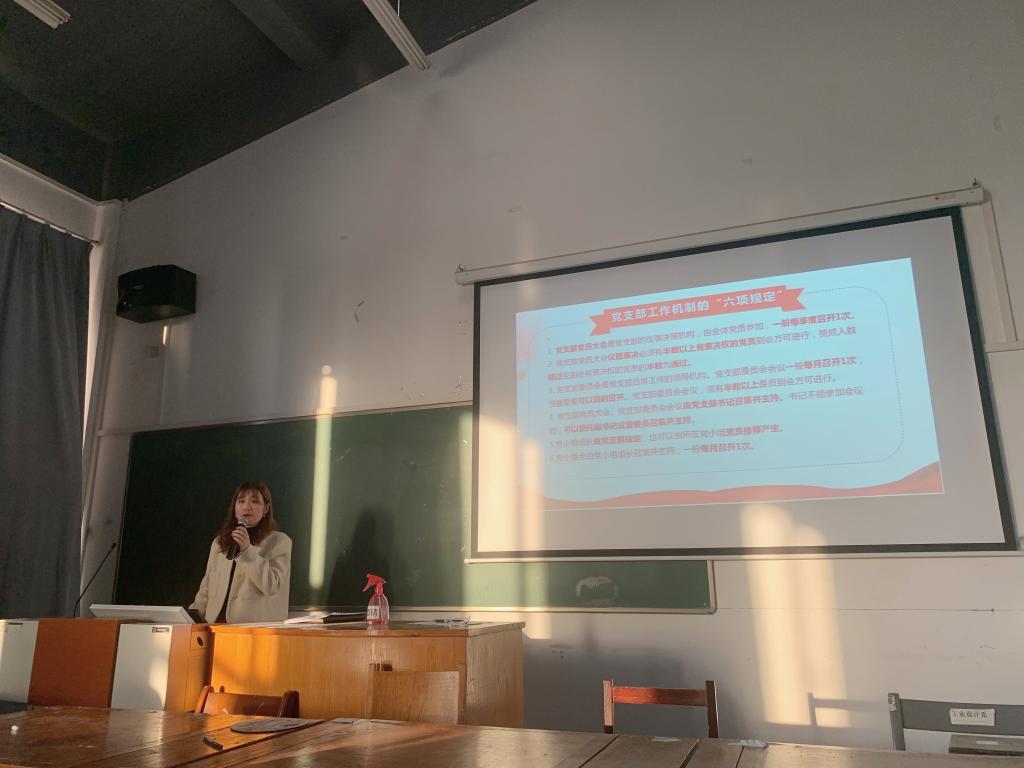 最后,由徐蓉念同志带领大家学习《中国共产党支部工作条例(试行)》。徐蓉念同志从12个方面为大家解读了《中国共产党支部工作条例(试行)》,带领大家明确党支部的三大定位、七项职责,坚持和加强党的全面领导,弘扬“支部建在连上”光荣传统,落实党要管党、全面从严治党要求,全面提升党支部组织力,强化党支部政治功能,充分发挥党支部战斗堡垒作用,巩固党长期执政的组织基础。
