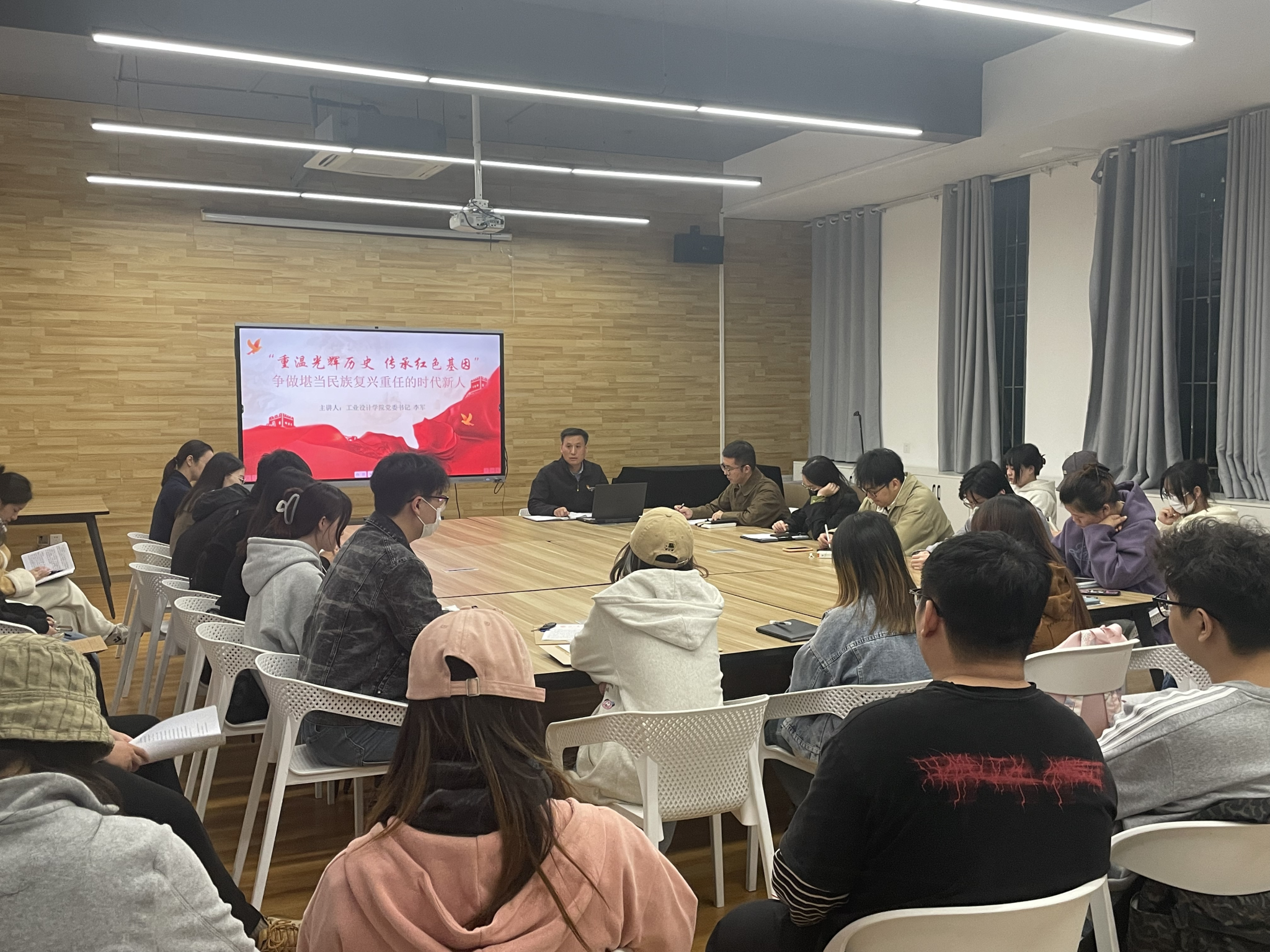 随后,李军讲授《重温光辉历史 传承红色基因——争做堪当民族复兴重任的时代新人》专题党课。从重温百年党史,从党史中汲取奋进力量、赓续红色血脉,弘扬中国共产党人精神谱系、坚守初心使命,争做堪当民族复兴大任的时代新人三个方面,通过详实的内容、丰富的例子、通俗的语言,对学员进行一次党性教育。他从“三个必然要求”阐释学习党史的重大意义,以“重大事件、重要会议、重要文件、重要人物”为切入点,提供一个学习党史的好方法。通过对中国共产党人精神谱系的梳理,回顾党的百年伟大征程四个阶段所凝练的重要精神,重温了新中国成立75周年来取得的辉煌成就。他对在场学员提了要求,一要勇于树立理想,二要敢于作为担当,三要乐于躬身实践,四要勤于吃苦耐劳,自觉发挥先锋模范带头作用,团结带领身边同学,共同为实现中华民族伟大复兴的中国梦贡献自己的青春与力量。