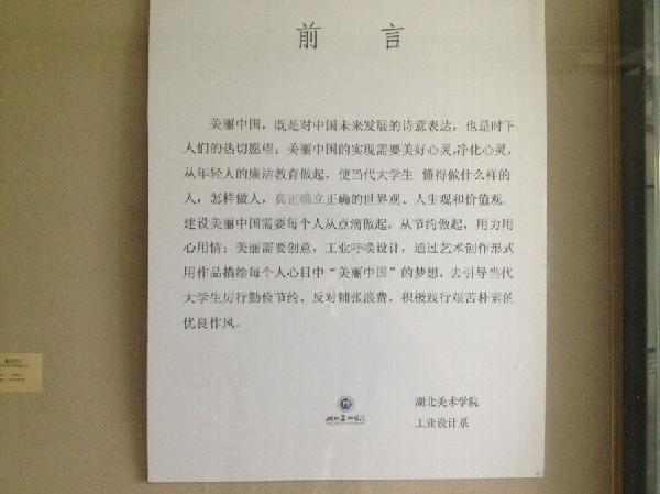 本次作品展以“美丽中国 从节约开始”为主题,旨在宣传中国传统美德,反对铺张浪费,弘扬校园新风和正能量。美丽中国,既是对中国未来发展的诗意表达,也是时下人们的热切愿望;美丽中国的实现需要美好心灵,净化心灵,从年轻人的廉洁教育做起,使当代老员工懂得做什么样的人,怎样做人,真正确立正确的世界观、人生观和价值观。建设美丽中国需要每个人从点滴做起,从节约做起,用力用心用情;美丽需要创意,工业呼唤设计,通过艺术创作形式,用作品描绘每个人心目中“美丽中国”的梦想,去引导当代老员工厉行勤俭节约、反对铺张浪费,积极践行艰苦朴素的优良作风。
