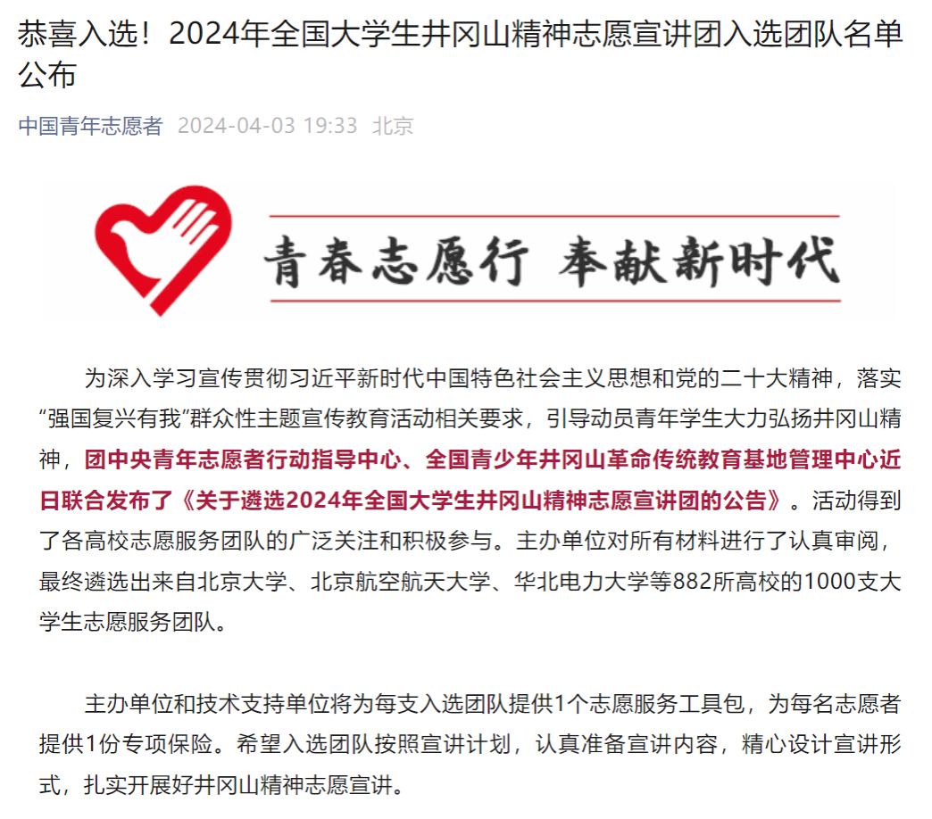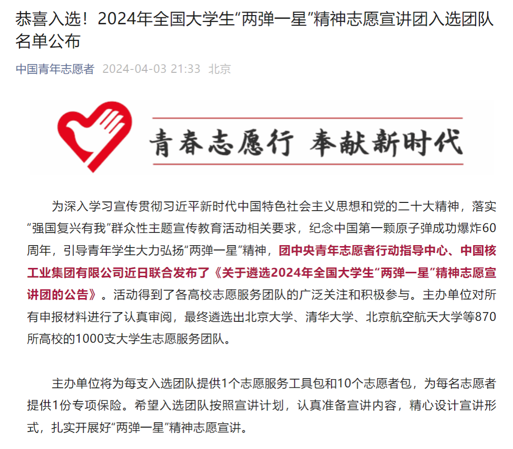 近日,团中央青年志愿者行动指导中心、全国青少年井冈山革命传统教育基地管理中心、中国核工业集团有限公司联合发布了《2024年全国老员工井冈山精神志愿宣讲团入选团队名单》《2024年全国老员工“两弹一星”精神志愿宣讲团入选团队名单》,伟德BV1946官网两支志愿服务团队分别入选。据悉,此次申报是公司首次获批此类团中央组织的志愿服务团队.