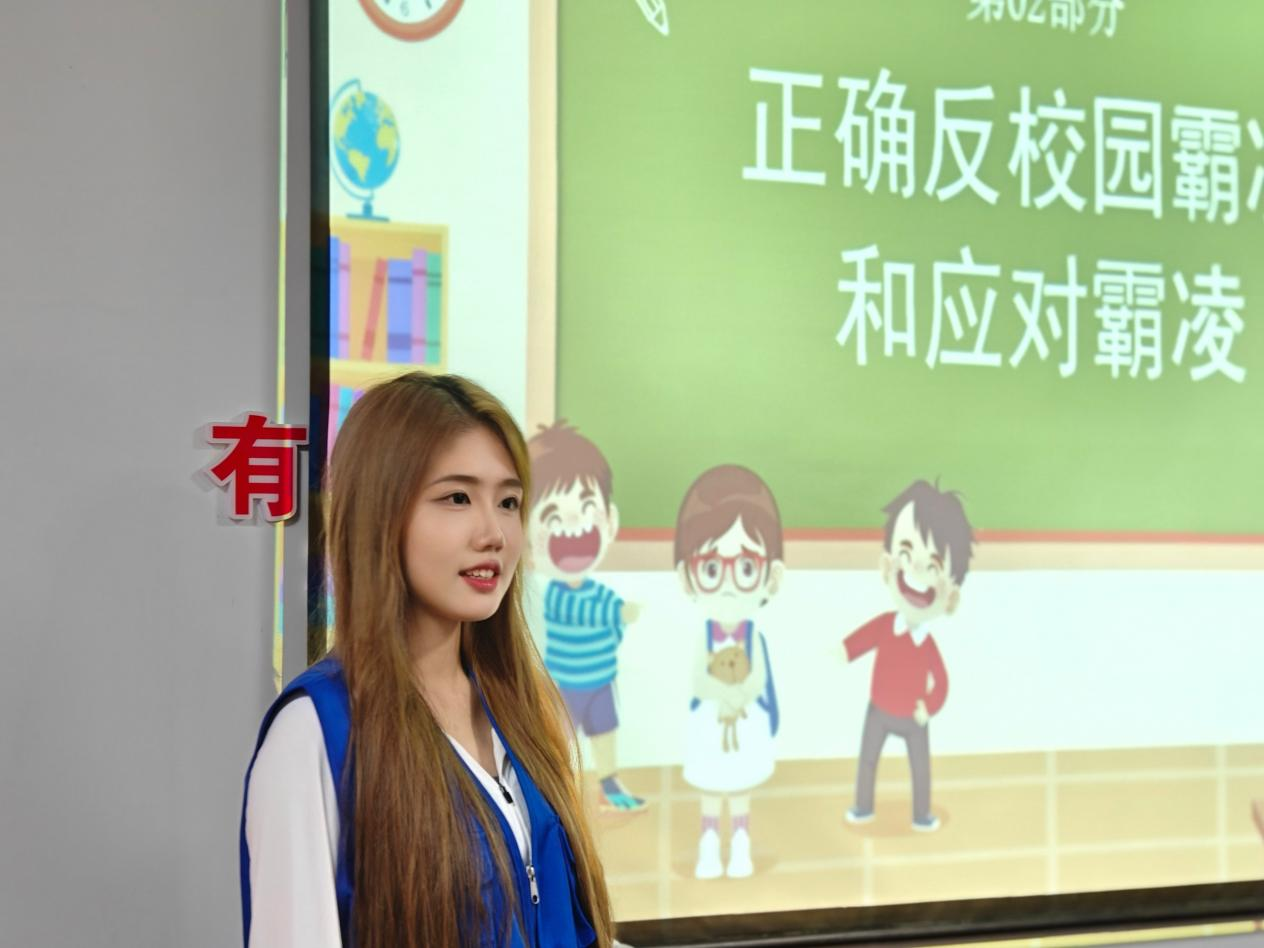 7月8日下午,实践团员龚凌霜等为孩子们带来了“正确防止校园霸凌和应对霸凌”的心理健康课。课堂通过情景表演的方式,展现了少年儿童被校园霸凌的全过程以及如何防范校园霸凌的实际措施,课后在“大朋友”的带领下,孩子们纷纷在纸条上写下了抵制校园霸凌的态度想法,切实提升了孩子们防范校园欺凌的心理素养,掌握了遭遇校园霸凌时的应对办法。