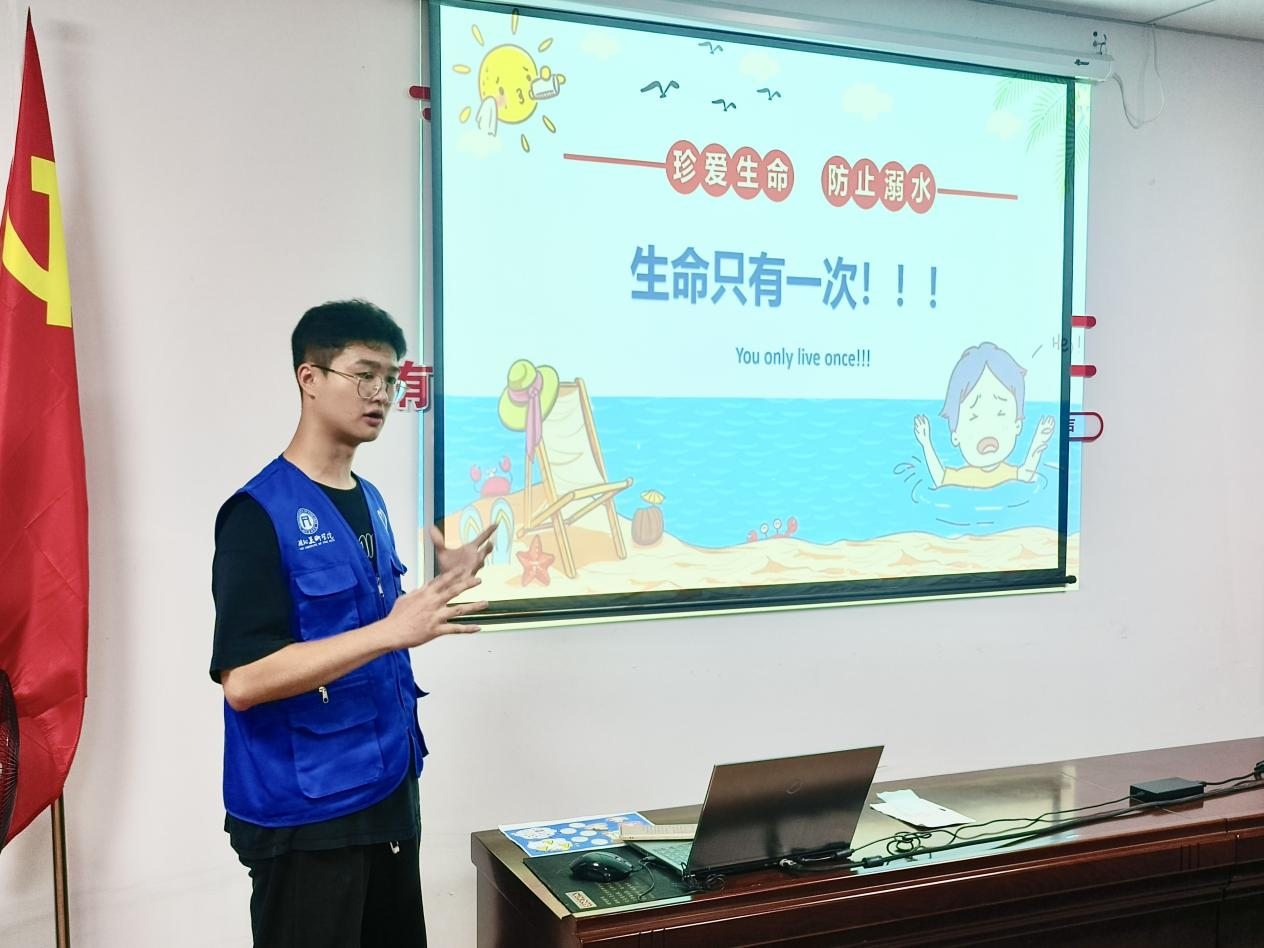 7月8日上午,实践团员崔永利等以图文并茂、生动活泼的形式为孩子们讲解防溺水措施“六不准”、溺水时的救护方法等知识,开展防溺水知识抢答赛、防溺水知识手绘等互动项目,现场气氛热烈。课后,40余名师生共同完成了“防溺水六不准”主题教育展板。
