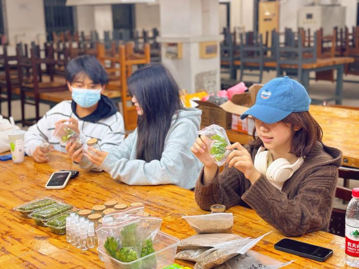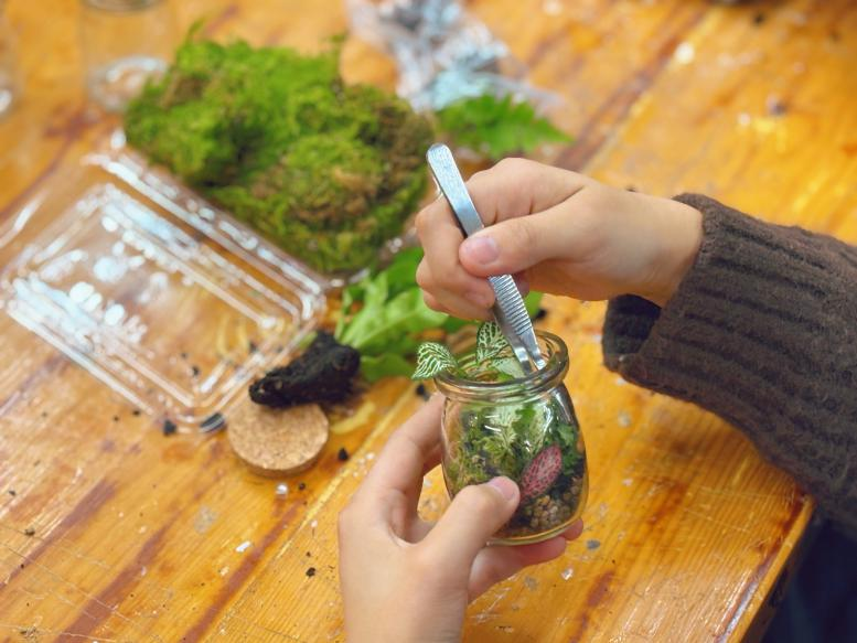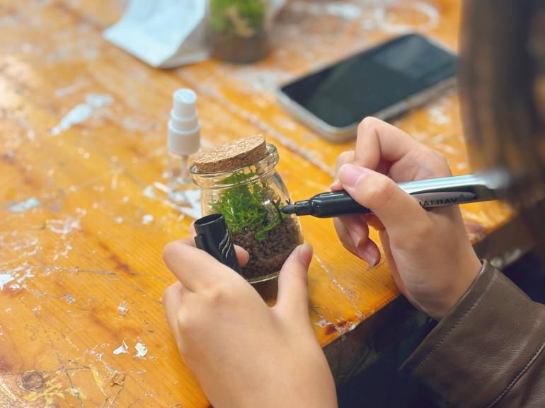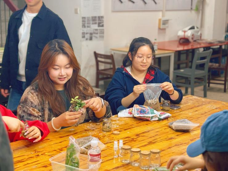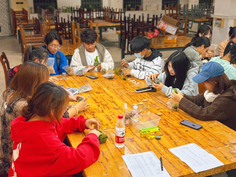 制作过程中,心理委员们分组合作,巧妙地采用植物、小石子、土壤等自然素材融入透明的玻璃瓶中。期间,相互交流着工作上的心得和体会,分享着彼此对心灵疗愈的理解与感悟,现场氛围温馨。