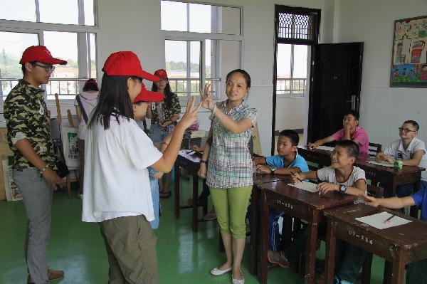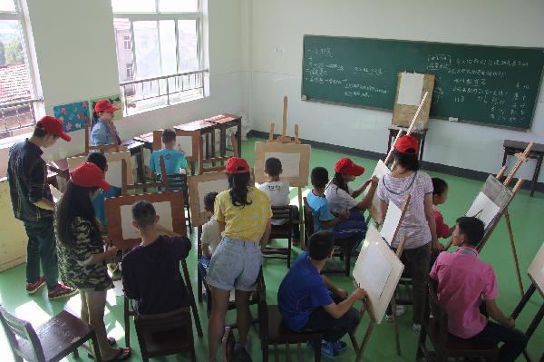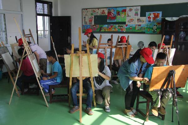 下午13时许志愿者们在校门口集合搬运画具,13时30分到达了位于江夏区纸坊的特殊教育公司。在经过负责人的讲解后,我们的活动正式开始了。在授课开始前,负责人邓老师认真地为志愿者介绍了每个孩子名字的手语,志愿者们则认真的学习着。在和孩子们进行了简单的互动后绘画课堂开始,由于孩子们基础薄弱,对绘画还没有十分深刻的了解,于是志愿者在第一节课决定为孩子们讲解正方体的知识。队员们分工明确,每人负责两位聋哑儿童,在他们困惑的时候耐心的讲解。虽然语言不通,但心与心的交流可以冲破一切,孩子们积极性高涨,就像汲取花蜜的勤劳小蜜蜂,不断的吸取学习知识,遇到不懂的问题,他们总是会拉着我们的手要我们讲解给他们听。经过3个小时的短暂相处,孩子们与志愿者们俨然成为了一家人,临走时纷纷挥手向志愿者们告别,他们的目光仿佛期待着志愿者们下次的到来.
