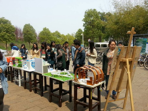 此次作品展主要展出了2012级展示设计专业员工的课程作业作品,展品主题桥与主题展厅分开摆在食堂门口,陆陆续续来进餐的同学逐渐聚拢过来参观作品,两天展品内容不同,可以让同学更加深刻了解到工业设计系的学业内容与学习的成果,展览期间安排专门的负责人给有疑问的同学讲解展品的理念、制作的过程以及软件制作的效果图等。