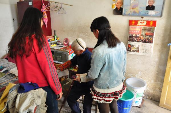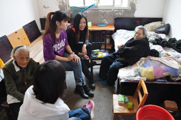 带着收获的喜悦,志愿者们经过2小时车程到达了敬老院,老人们热情地欢迎了大家,志愿者们也立即投入到了对老人的交流慰问中。他们给老人们奉上了蛋糕、饼干、牛奶等慰问品,为老人们呈上了文艺节目,陪老人们散步聊天,帮老人们打扫卫生,为老人们按摩捶背,敬老院里萦绕着欢声笑语,弥漫着幸福祥和的气氛。