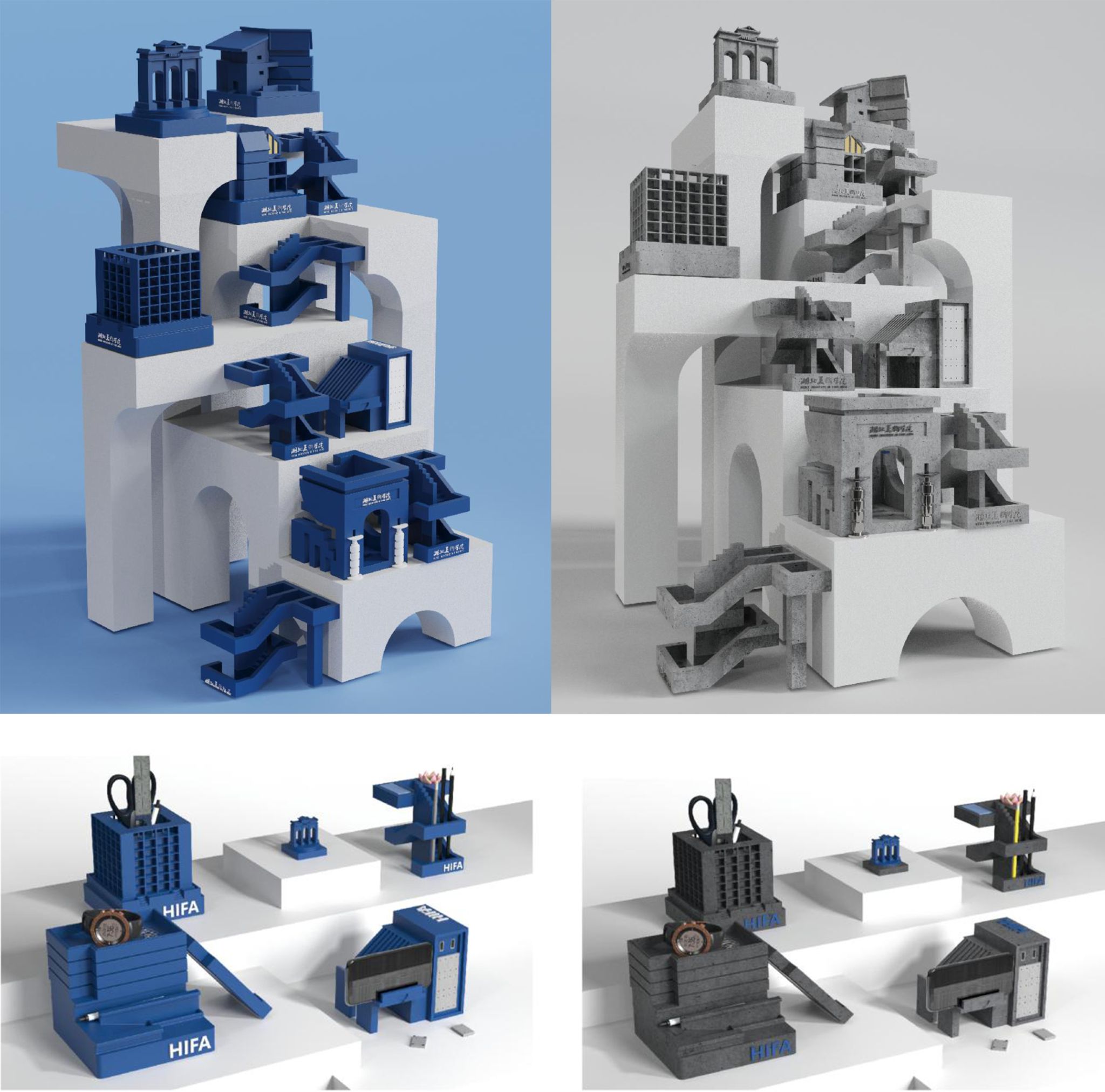 本次参赛作品以建筑、空间、工业及公司标志性建筑与环境为核心设计元素,经过精心重构,旨在展现其独特魅力。在美学启发的指导下,作品致力于通过朴实无华的材质质感、稳定可靠的结构和经典的建筑形态,传达出“崇德、笃学、敏行、致美”的校训精神。同时,作品也寓意着一步一个脚印、脚踏实地的向上攀登精神,不仅体现了对高品质的不懈追求,更彰显了对人本理念的坚守与执着,以及对新征程下伟德BV1946官网面向未来的美好祝愿。