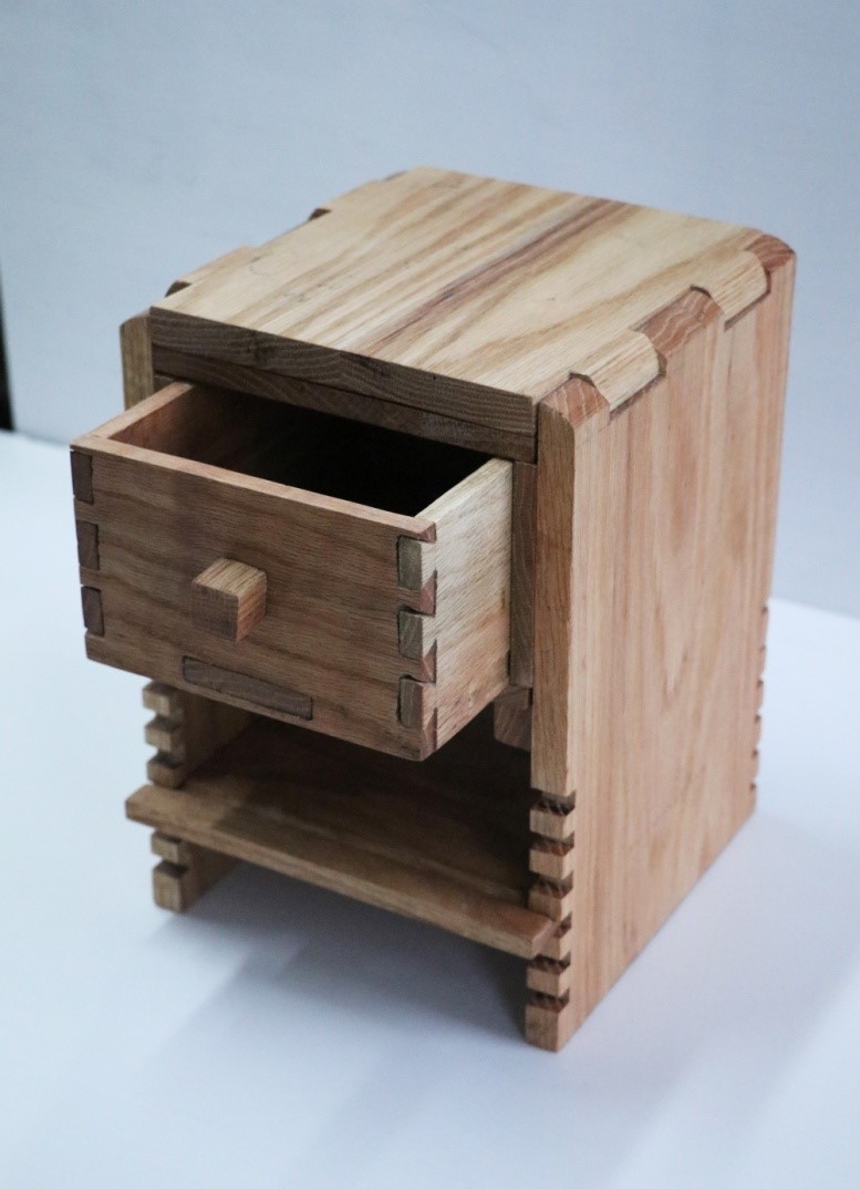 1.草图创意设计一款榫卯结构产品,并绘制出三视图及结构爆炸图。2.挑选并购买合适的硬木,并对木材进行型材切割加工。3.在型材上绘制出榫头和卯眼,并手工制作榫头和卯眼,使之匹配。4.对木模型进行表面打磨并上油处理。考核要求:运用榫卯结构,不使用任何胶水和铁钉,结构稳固相互匹配,表面平整光滑,制作完整有细节,并具有一定功能性。