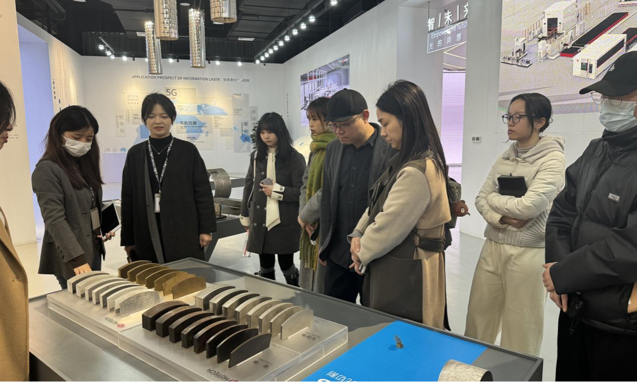 在华工激光副总经理冯书云、工业设计中心总监汪若红、行政总监范云霞的陪同下参观了华工科技激光科技馆,汪若红总监详细介绍了我国激光技术的发展历程及华工激光的企业科研成果与应用领域,通过实际的技术产出,让我们直观感受到了高端技术服务新型工业化发展的生动实践。