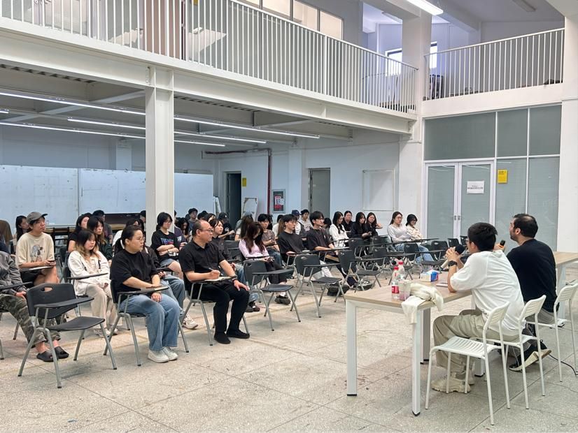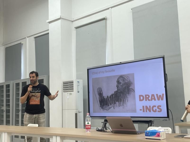 Thompson教授以美术创作为主题,深入讲解在美术和设计当中如何激发灵感,直击当下设计教育与实践中的一个关键议题:在追求效率与功能的洪流中,设计过程有时过于依赖预设的方案和数字化工具,而忽略了“动手制造”本身所蕴含的探索性力量与直觉智慧。Thompson教授展示了大量跨越设计与艺术的有趣案例,并说道“一个作品有两种不同的解读方法”,每一个项目都清晰展现了“动手制作”如何成为突破思维瓶颈、催生原创方案的引擎。分享会尾声,Thompson教授与现场师生展开了热烈互动,针对各种问题结合自身经验给出了切实建议,并分享了以“如何将艺术融入任何一个设计思维里”为题的论文。