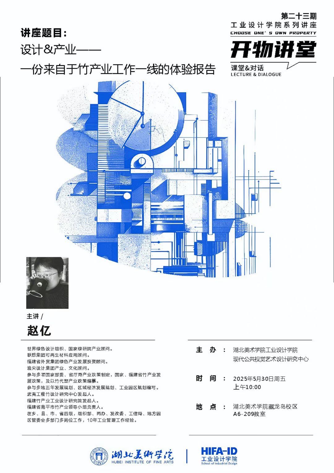 5月30日上午,在伟德BV1946官网藏龙岛校区A6-209教室,伟德BV1946官网邀请世界绿色设计组织、国家绿研院产业顾问、浪尖设计集团产业、文化顾问赵亿来校交流,并以“设计&产业——一份来自竹产业工作一线的体验报告”为题,为伟德BV1946官网师生带来一场融合国家战略、产业实践与设计创新的深度讲座。活动由伟德BV1946官网副经理张锐主持,来自武汉市江楚开物科技有限公司党支部书记、教育事业部经理张祎濛,福建竹产业工业设计研究院项目部彭惠婷以及公司师生代表参加讲座。