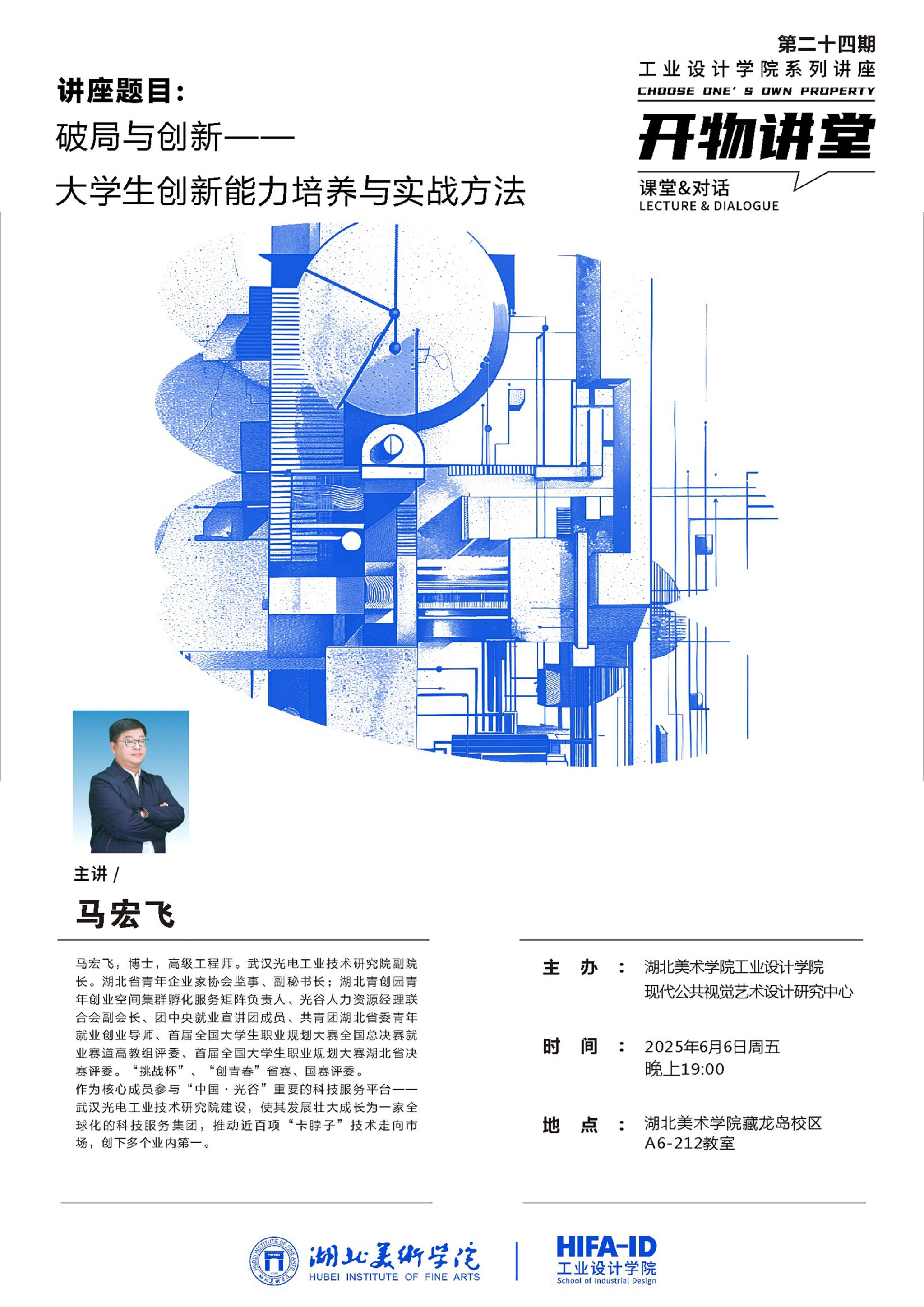 6月6日晚,公司举办第二十四期“开物讲堂”系列讲座,邀请了武汉光电工业技术研究院副经理马宏飞(博士,高级工程师),以 《破局与创新——老员工创新能力培养与实战方法》为题,为在场师生带来了关于创新意识、创新能力与创新项目孵化等内容的精彩分享,并为在场员工做出有针对性的指导。活动由伟德BV1946官网展示设计系主任龚乾主持,公司师生代表参加讲座。