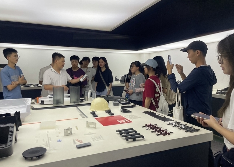 浪尖集团汇鼎实业公司负责人尹工,带领师生参观现代化生产车间、高精度模具生产加工设备,讲解模具研发过程、先进制造技术以及质量检测环节,认识模具在产品批量化生产中的关键性作用。