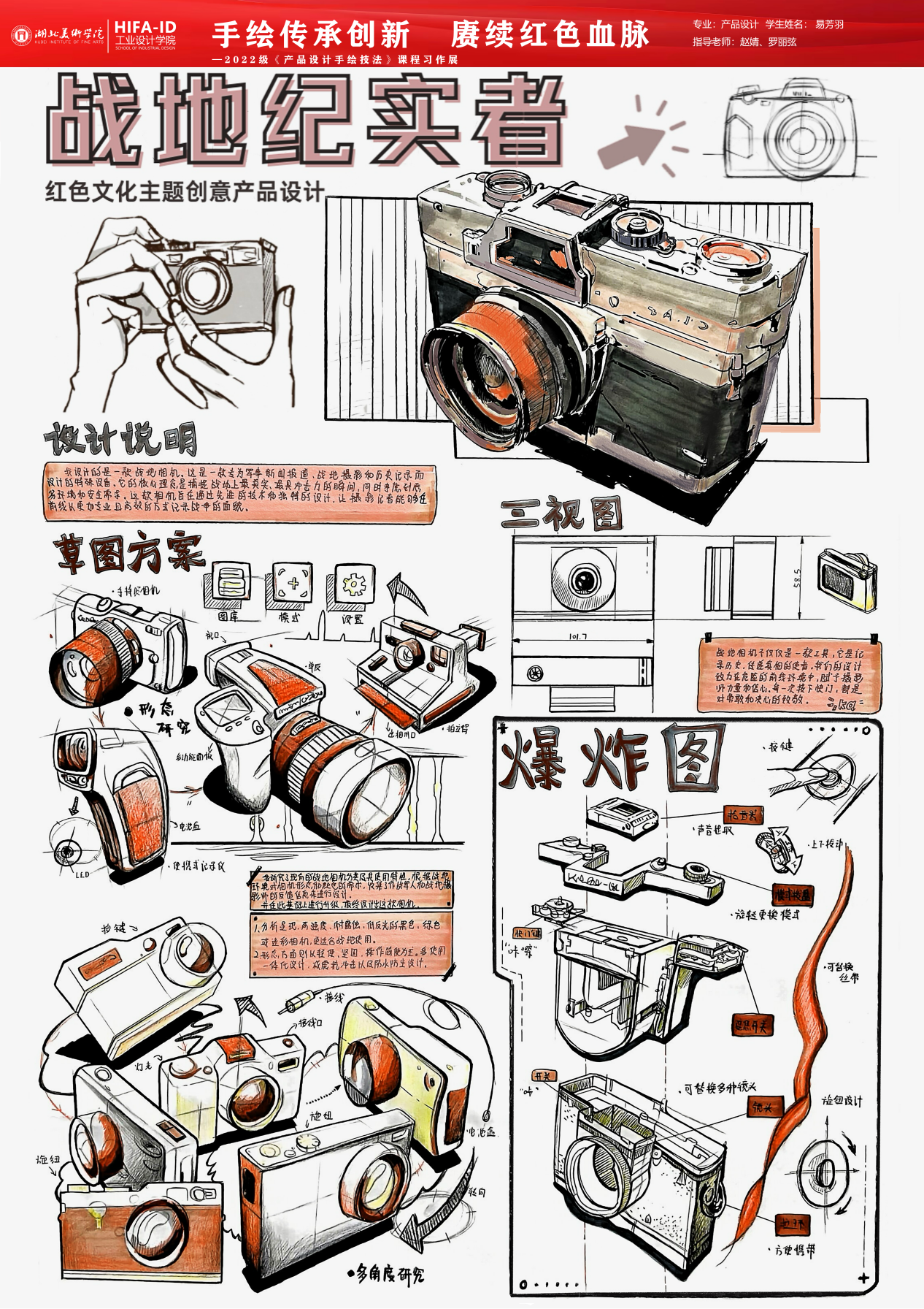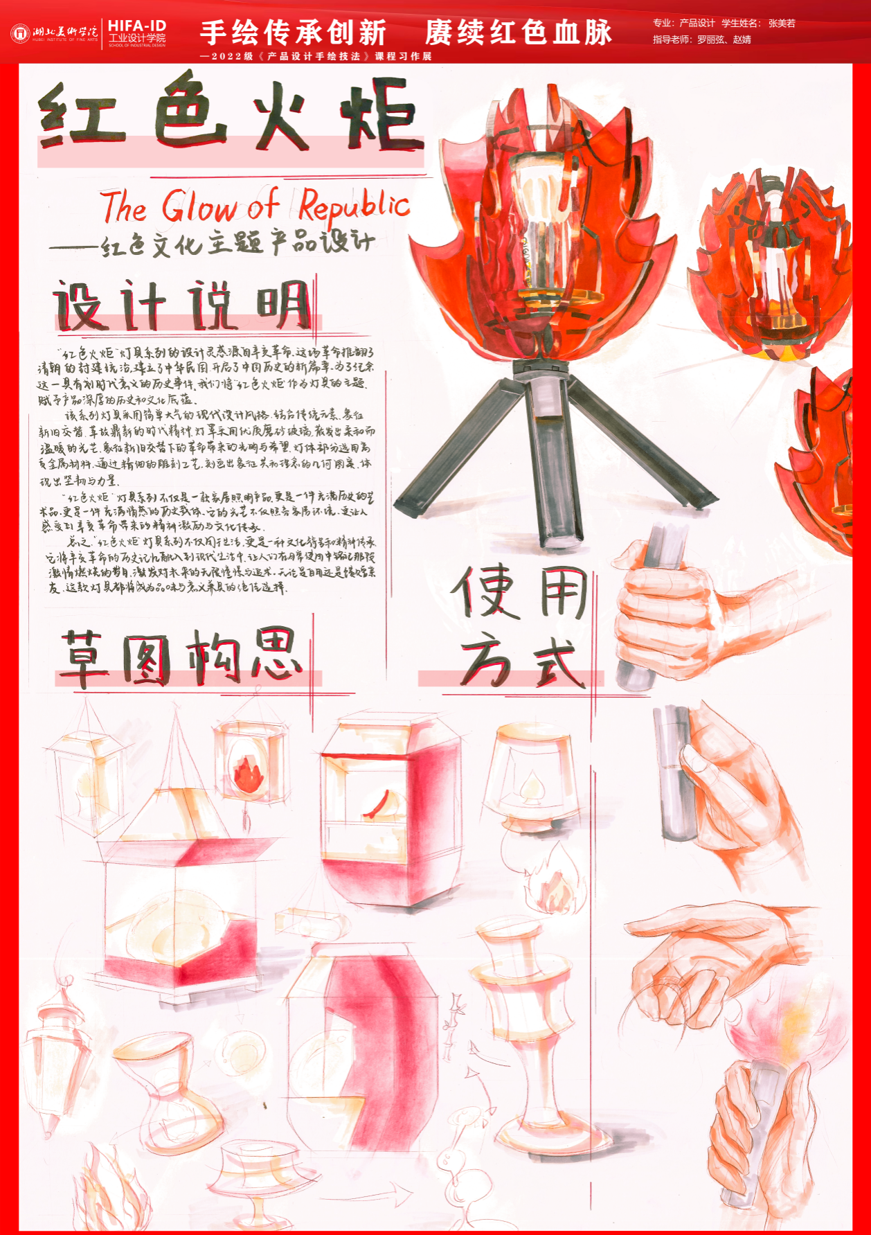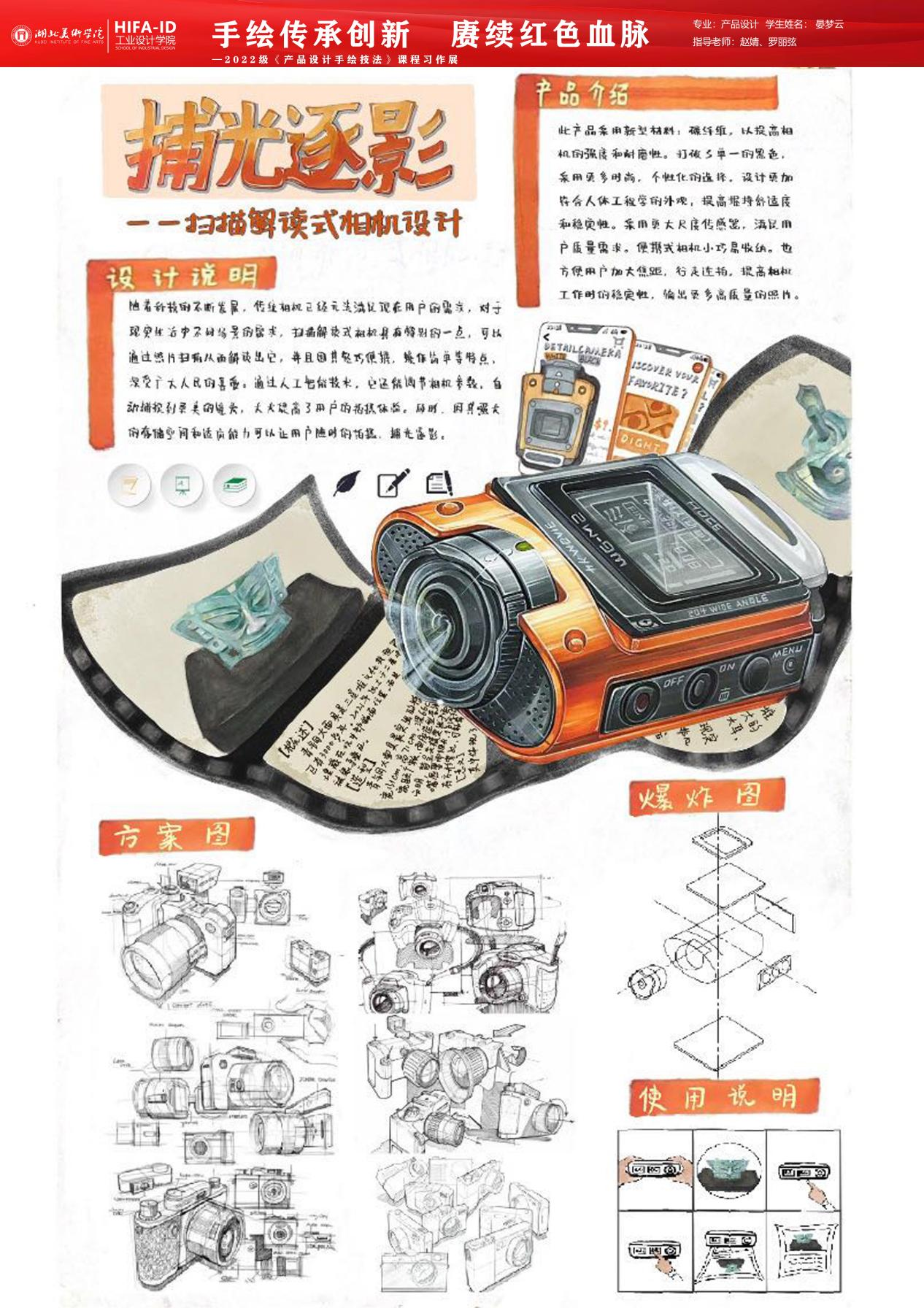 《产品设计手绘技法》课程习作展在手绘技法的传承,不仅仅是技巧的传授,更是对设计师艺术修养和审美意识的培养。强调手绘在产品设计中的重要性,是因为手绘能够直观地反映设计师的内心世界和创作理念。在传承手绘技法的同时,我们更要注重创新,将手绘技法与现代设计理念和科技手段相结合,赓续红色血脉,传承优秀文化,创造出更多具有时代特色和民族特色的设计作品。