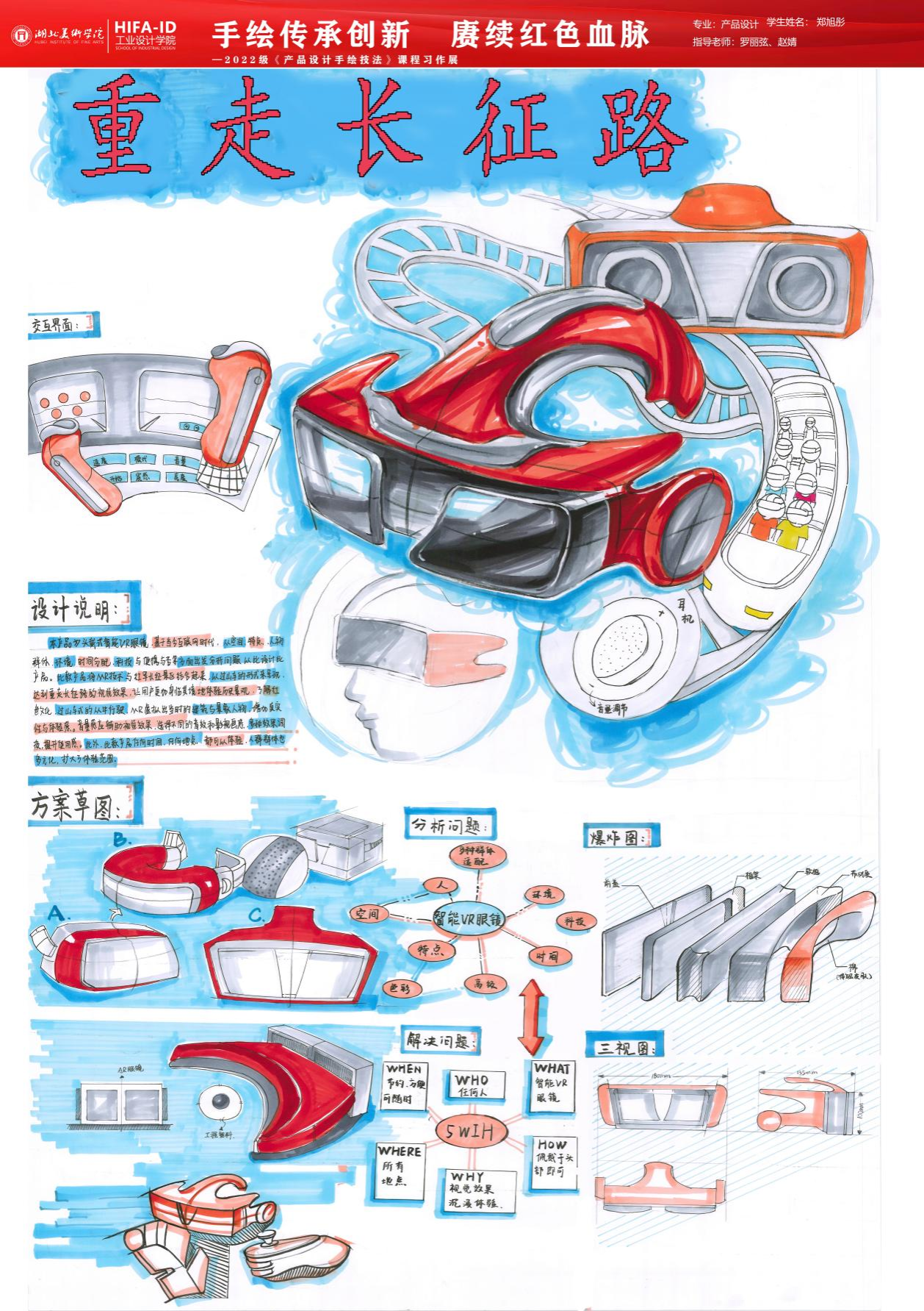 2024年6月17日,伟德BV1946官网2022级产品设计专业《产品设计手绘技法》课程习作展在A6教学楼2楼举行。在产品设计领域的广袤天地中,手绘技法作为设计师表达创意、沟通想法的桥梁,承载着传承与创新的重任。《产品设计手绘技法》课程旨在赓续红色血脉,弘扬革命精神,通过系统的教学与训练,培养员工的创新思维和实践能力,为新时代的产品设计注入新的活力。